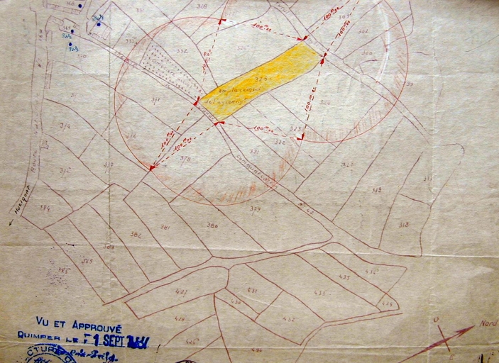Extrait cadastral de 1937, projection d'agrandissement du cimetière, par A. Coignat, architecte, Carhaix (A.D. Finistère, 2 O 430)Immatriculation