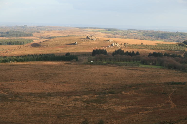 L'ancien marais, le Roc'h Cléguer et le réservoir de Saint-Michel, vue prise depuis la chapelle Saint-Michel en direction EstImmatriculation