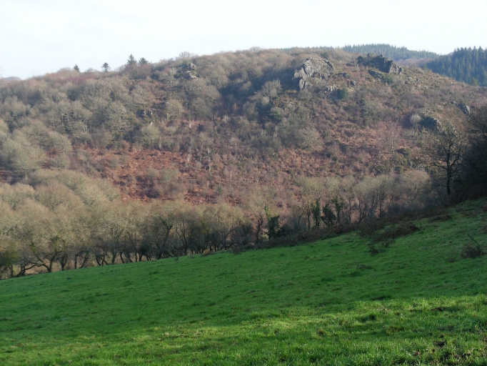 La vallée encaissée de la rivière de l'Ellez au nord de Lesquélen, avec l'affleurement granitique de Reundu (Loqueffret)Immatriculation