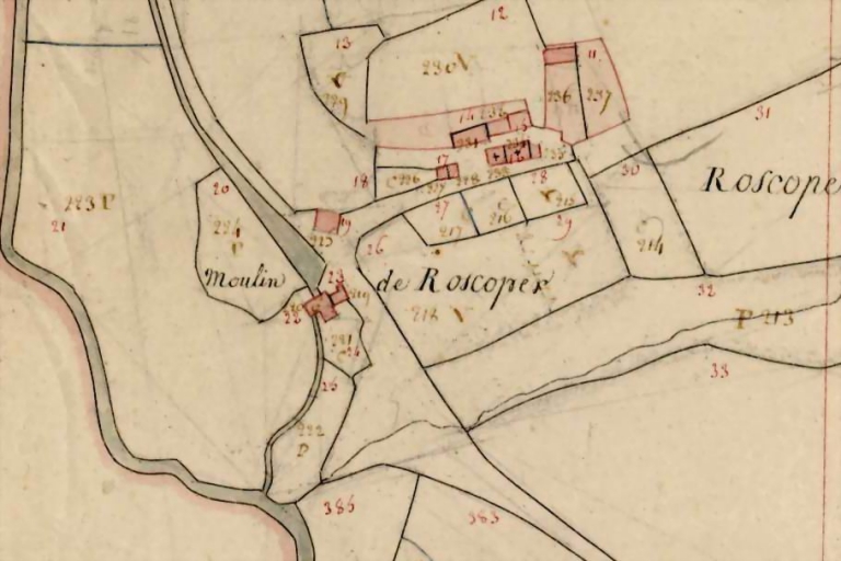 Le moulin de Roscoper en 1812. Extrait du cadastre, section G 1 (A.D. Finistère, 3 P 19)Immatriculation