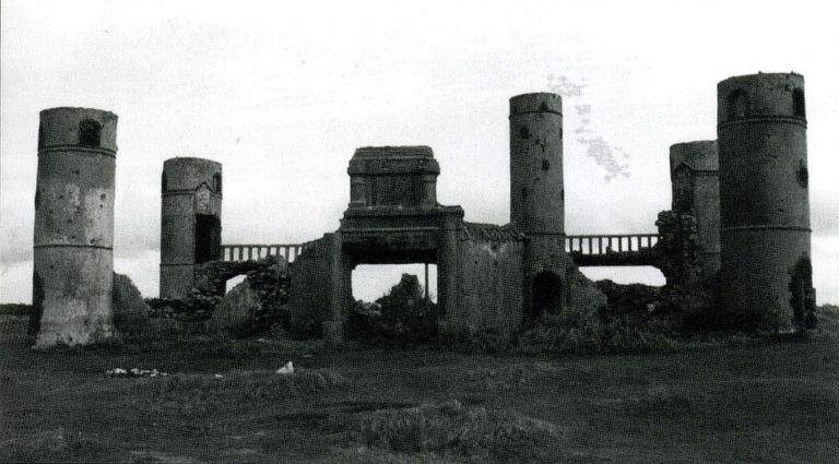Photographie ancienne des ruines du manoir après la guerre, ancienne façade ouest (repro. C. Mammami et G. Béchard, 1995)Immatriculation