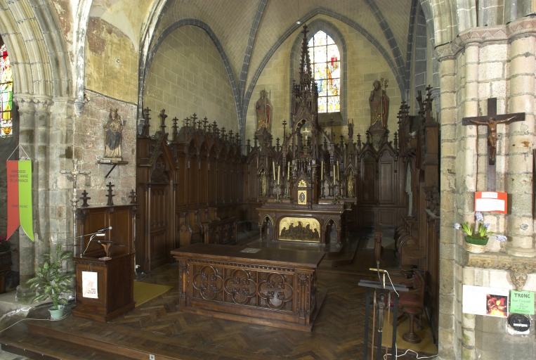 Décor de choeur : lambris de revêtement, 2 bancs de choeur, bas-reliefs,