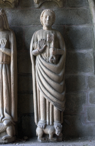 Ensemble de 4 statues : Saint Pierre ; Vierge (?) ; Saint diacre ; Saint (?), et d'une tête,