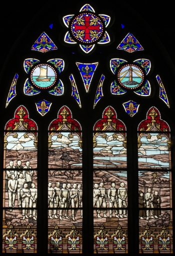 Verrière ex-voto : Procession des marins sur la grêve de Saint-Suliac,
