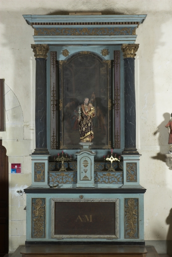 Ensemble du premier autel secondaire sud : autel, tabernacle, retable, 2 gradins d'autel, 3 gradins d'autel,