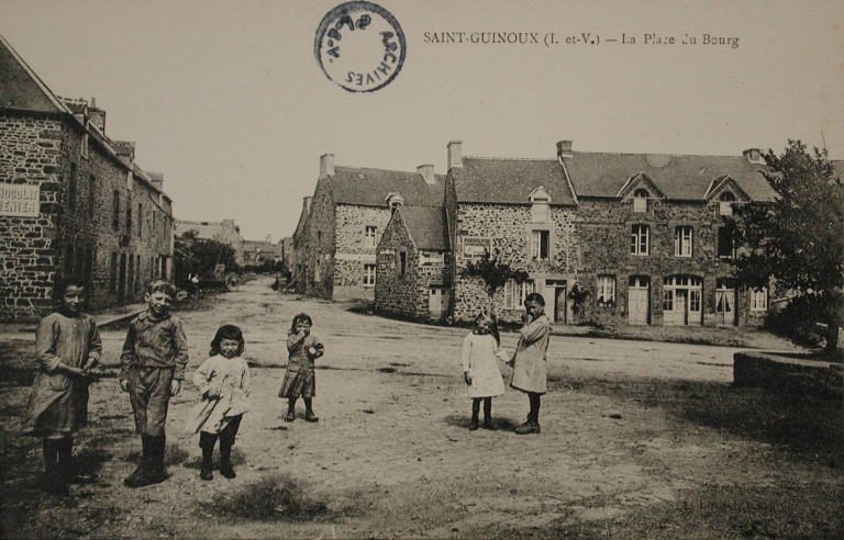 Reproduction d'une carte postale du début du 20e siècle, la place du Bourg. (A.D.Ille-et-Vilaine : 6Fi)Immatriculation