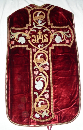 Ornement rouge 2 : chasuble, manipule, étole, bourse de corporal et voile de calice,