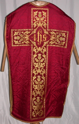 Ornement rouge 1 : chasuble, bourse de corporal, étole, manipule, voile de calice,