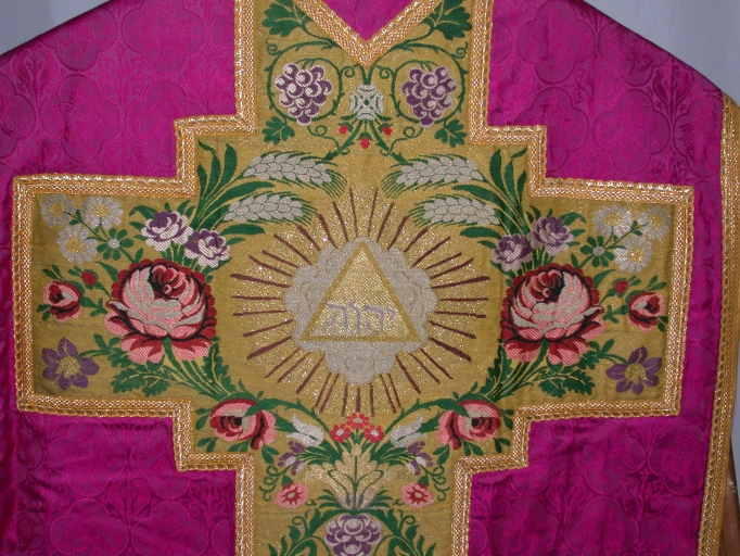 Ornement rouge 2 : chasuble, bourse de corporal, étole, manipule, voile de calice,