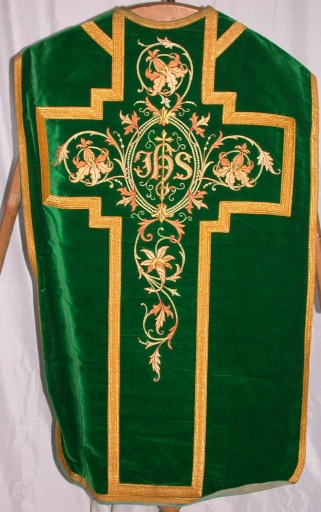 Ornement vert : chasuble, bourse de corporal, étole, manipule, voile de calice,