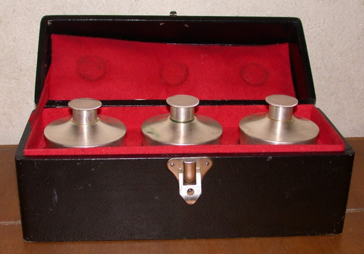 Réserve à huile des catéchumènes, réserve à huile des malades, réserve à saint chrême dans leur coffret,