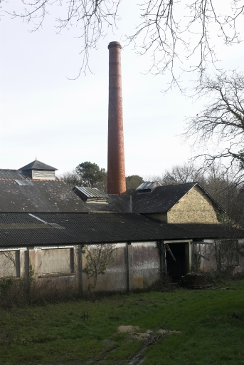 Vue générale ouest des bâtiments de production : au fond la grande halle, devant l'une des halles latérales avec appentis ouvrant sur la cour. A droite la chaufferie et sa cheminée.Immatriculation