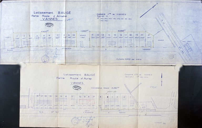 Plan du lotissement Baugé : partie route d'Auray et partie route d'Arradon, 31 mars 1952. AM Vannes 1O211.Immatriculation