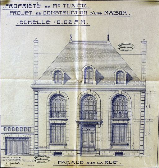 Elévation antérieure par Guy Caubert de Cléry, 19 septembre 1932. AM Vannes 5I162.Immatriculation
