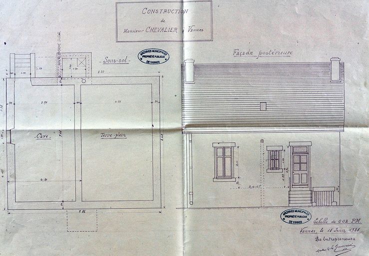 Plan et élévation de la façade postérieure de la maison de monsieur Chevalier par les entrepreneurs Madec et Le Guernevé dressés le 18 juin 1928. AM Vannes 5I162.Immatriculation
