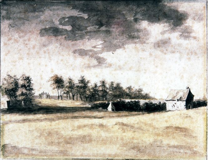 Dessin de la partie est du domaine avec le portail d'entrée, la fontaine et le moulin, 18e siècle. Fonds privé.Immatriculation