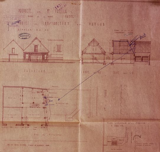 Plan et élévation des hangars de monsieur Prella, 1947-1948. AM Vannes 1G59.Immatriculation