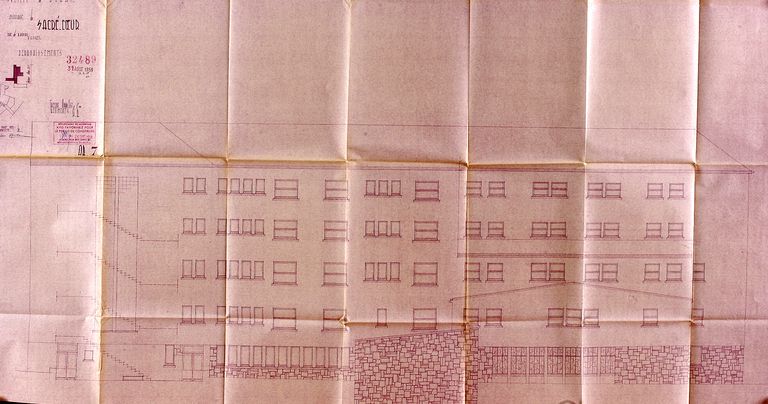Projet d'agrandissement de la clinique par Guy Caubert de Cléry, bâtiment A-B élévation façade nord-est, 31 août 1959. AM, Vannes 1 G 59.Immatriculation