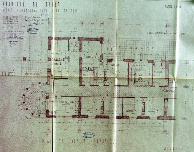 Projet d'agrandissement du bâtiment principal, par G. Caubert de Cléry, 20 février 1948. Plan du rez-de-chaussée. AM Vannes 1G59.Immatriculation