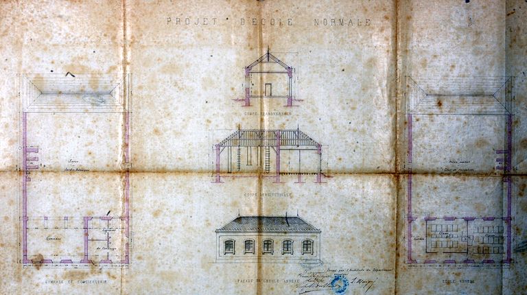 Pavillons latéraux, gymnase, logement du concierge et école d'application. Plans et élévation, par Maigné, 1881. AD Morbihan, N 757.Immatriculation