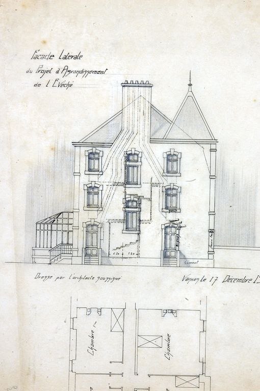 Projet d'agrandissement de l'évêché par Joseph Caubert de Cléry, 17 décembre 1922 : élévation latérale. AD Morbihan 149 J 247.Immatriculation