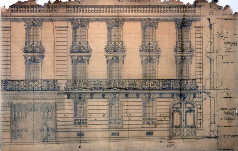 Elévation ouest sur la rue Decker. Dessin par Joseph Caubert de Cléry pour M. Jacquet, novembre 1903. AD Morbihan 149 J 296.Immatriculation