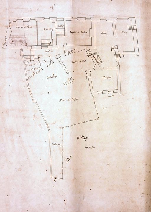 Plan d'aménagement de l'imprimerie Lafolye par Joseph Caubert de Cléry pour M. Jacquet, novembre 1909-1910 : rez-de-chaussée. AD Morbihan 149 J 296.Immatriculation