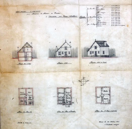 Projet pour la maison du recteur de Trussac par Joseph Caubert de Cléry : plans, coupes, élévations, 22 octobre 1926. AD Morbihan 149 J 255.Immatriculation