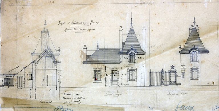 Projet pour la maison du concierge par Joseph Caubert de Cléry : plans, coupes, élévations, 21 septembre 1920. AD Morbihan 149 J 359.Immatriculation