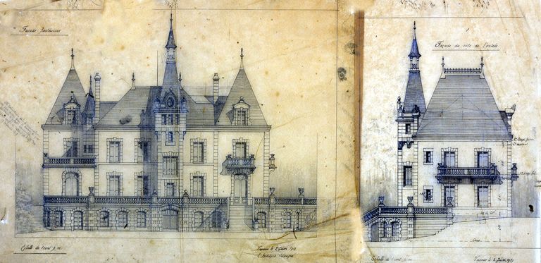 Projet pour la maison Douaud par Joseph Caubert de Cléry : élévation sur jardin, 1919. AD Morbihan 149 J 358.Immatriculation