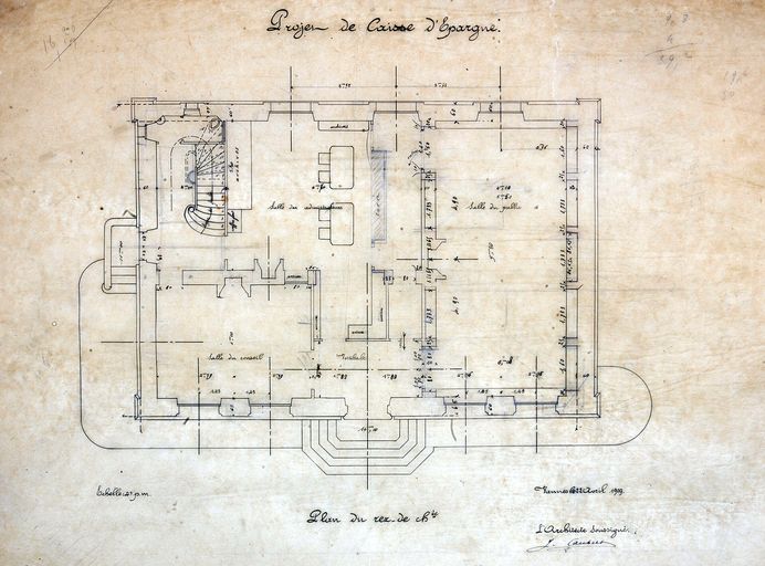 Construction de la Caisse d'Epargne par J. Caubert, 1914 : plan au sol. AD Morbihan 149 J 290.Immatriculation