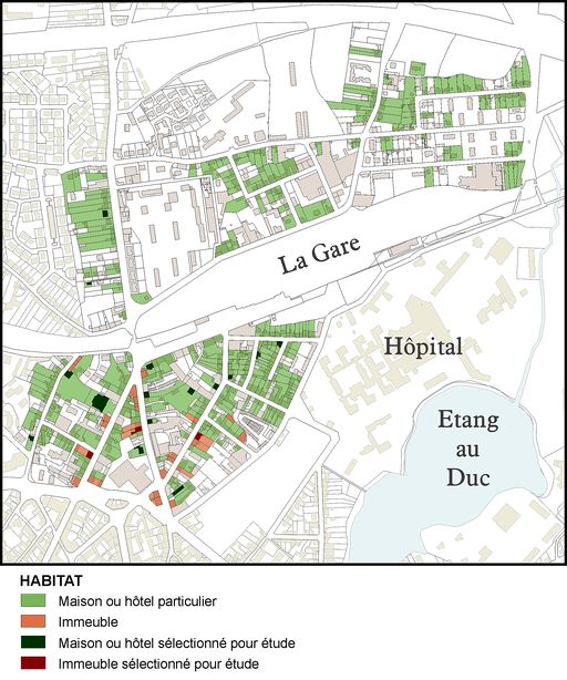 Le quartier de la gare : carte de l'habitat recensé. Dessin Christophe Le Pennec.Immatriculation