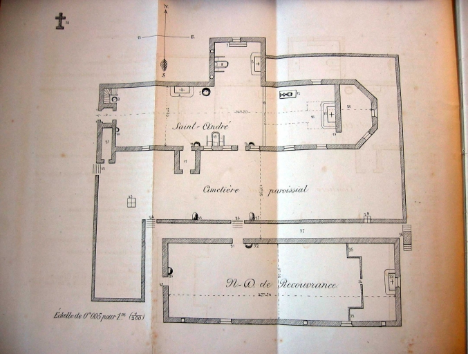 Plan de l'ancienne église avec emplacement de l'ossuaire au sud-ouest, croquis par l'abbé Le Tallec. AD Morbihan.Immatriculation