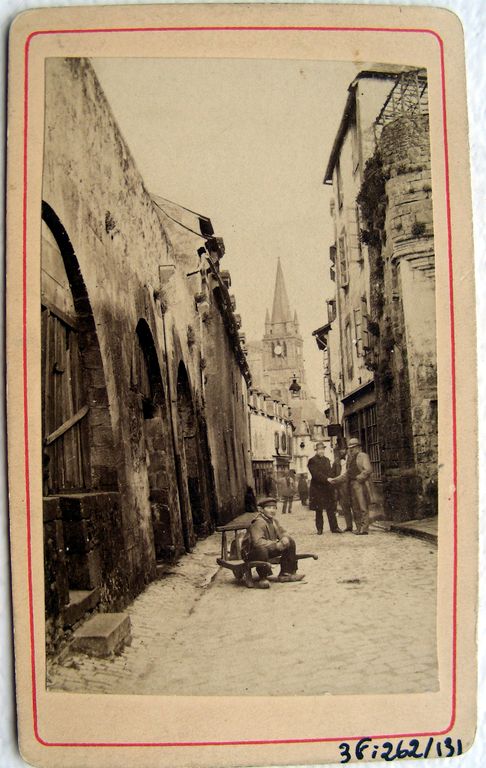 Vue de la rue Burgault vers 1875 : anciennes écuries de l'évêché. Cliché Henri Martine, vers 1875. AD Morbihan 3 Fi 262/131.Immatriculation