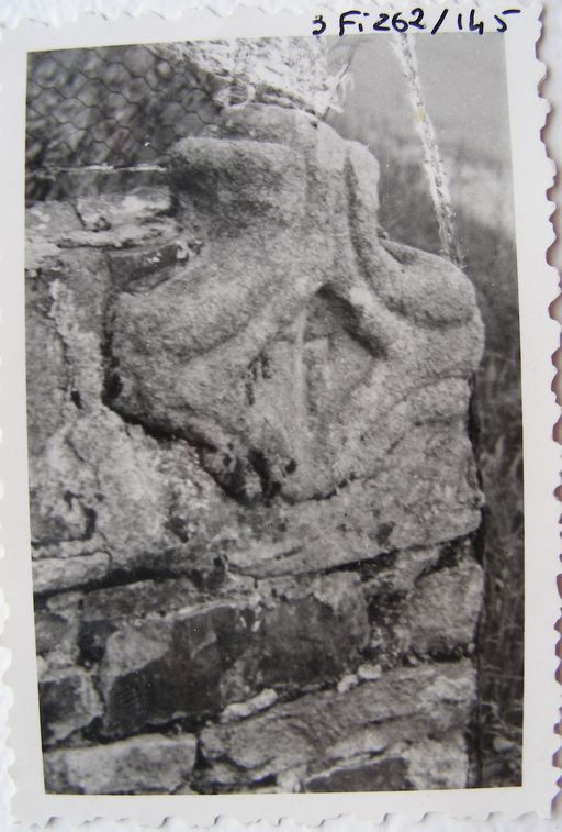 Croix intégrée dans un mur d'enclos route de Conleau. Vue de détail, vers 1960 , Cliché Godineau. AD Morbihan 3 Fi 262/145.Immatriculation