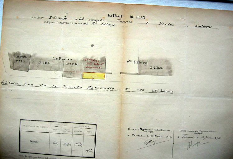 Demande de F. Huchet, entrepreneur à Vannes pour Mme Delory pour la reconstruction de sa remise de l´hôtel du commerce rue du Mené à Vannes. Plan du 16 juillet 1906. AD Morbihan S 1210.Immatriculation