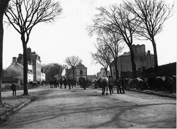 Foire aux chevaux sur la place de la Madeleine : au centre, l'octroi, vers 1895. AM Vannes fonds Jean Frélaut, peintre-graveurImmatriculation