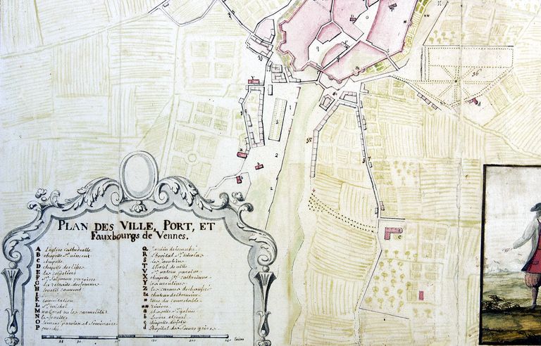 Description historique... du président de Robien : plan de Vannes, partie sud, milieu du 18e siècle (d sur le plan). Bibliothèque de Rennes-Métropole.Immatriculation