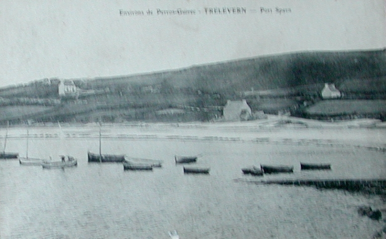 Canots de pêche mouillés dans l'anse de Pors Spern, 1er quart 20e siècle : remarquer la maison de pêcheur (carte postale, collection particulière)Immatriculation