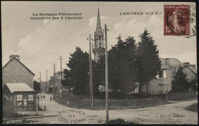 Lancieux, le bourg. Le carrefour des Quatre Chemins, la voie ferrée au premier plan, 2ème quart du 20ème siècle (AD 22)Immatriculation