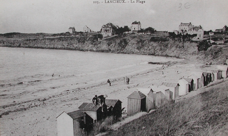 Cabines de bain sur la grande plage de Lancieux au début du 20ème siècle (carte postale, collection particulière)Immatriculation
