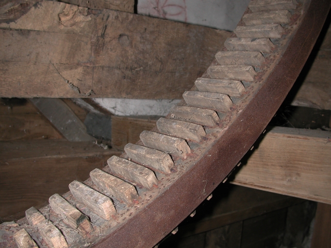 Détail des dents ou aluchons du rouet en bois (la lanterne est en fonte)Immatriculation