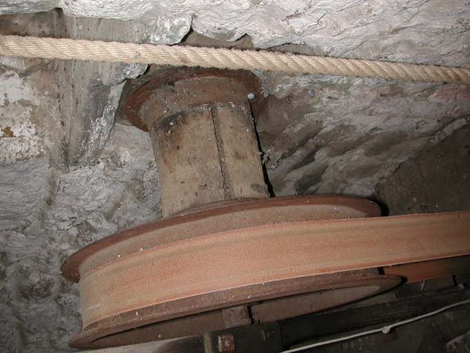 Vue du système d'entraînement : tambour pour lever les sacs à grains avec les poulies folles, en utilisant la force du ventImmatriculation