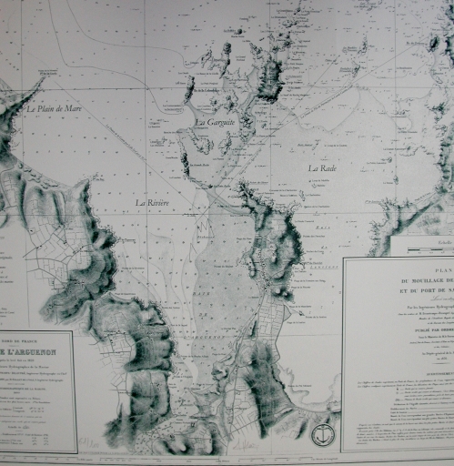 Extrait de la carte de la baie de l'Arguenon, 1829 (Beautemps-Beaupré) : remarquer les pêcheries indiquées à l'ouest de la plage des Haas, dans l'Arguenon (collection particulière)Immatriculation