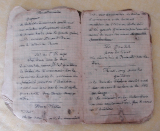 Descriptif manuscrit des marques (basses à lieus) dans le carnet de pêche de Jacques Robert (collection particulière)Immatriculation