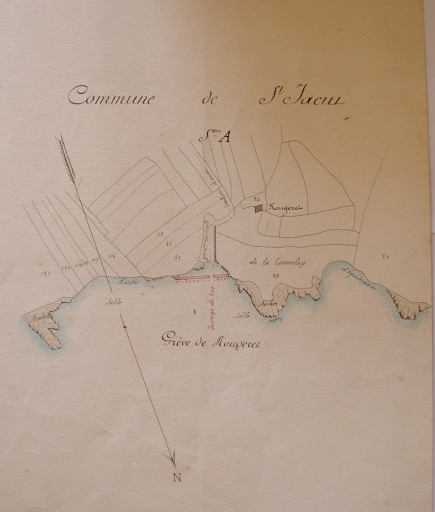 Plan de la grève du Rougeret en 1883, avec projet d'équipement de cabines de bains privées : remarquer le charroi (AD 22)Immatriculation