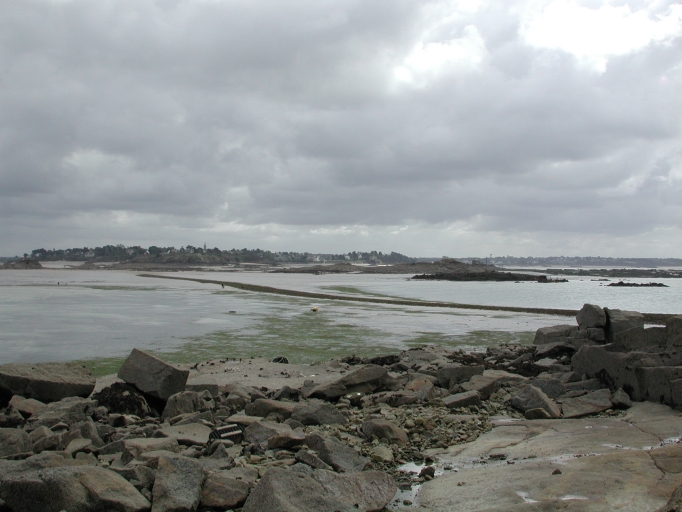 Vue de l'environnement maritime à l'Est de la Colombière : remarquer au 1er plan les déchets de taille et au second plan, le sillon et la 'jointure' entre la pointe du Chevet et l'île des EbihensImmatriculation