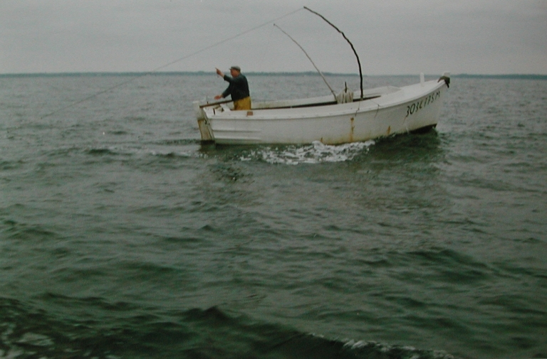 Pierre Aubin à bord de la 'Mascotte', en pêche aux lignes à maquereaux avec les tangons, vers 1960-70 (collection particulière)Immatriculation