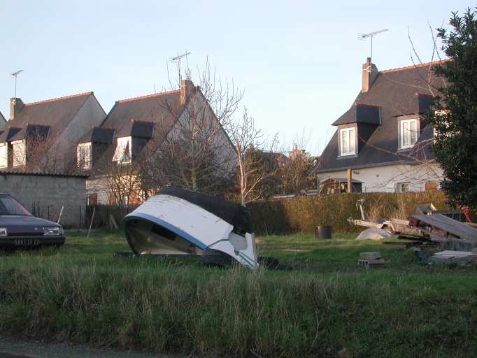 Vue d'un doris hiverné, coque retournée à l'enversImmatriculation