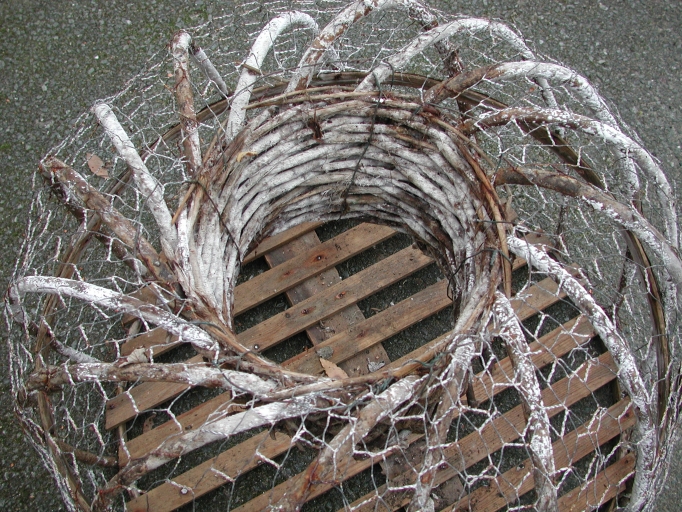 Vue de détail d'un casier à homards : remarquer le recouvrement du casier en grillage et le fond en lattes de bois